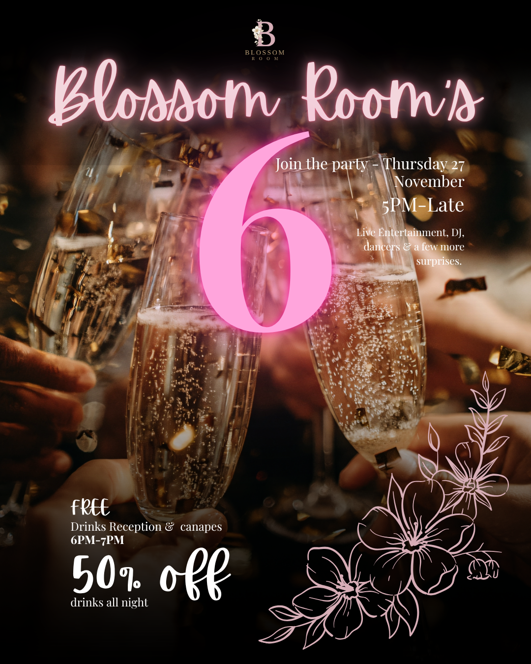 Join us on Thursday 27 November from 5 pm as Blossom Room celebrates six incredible years in style. Expect live entertainment, DJs, dancers, and a sparkling drinks reception with canapés from 6 pm to 7 pm, plus 50% off drinks all night.